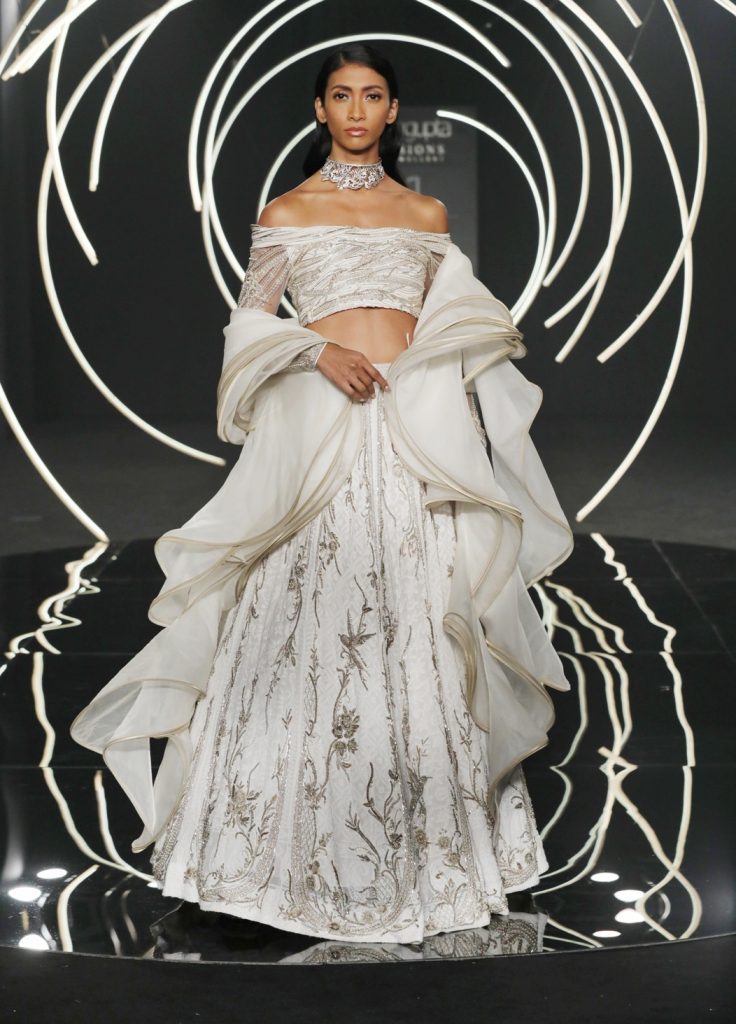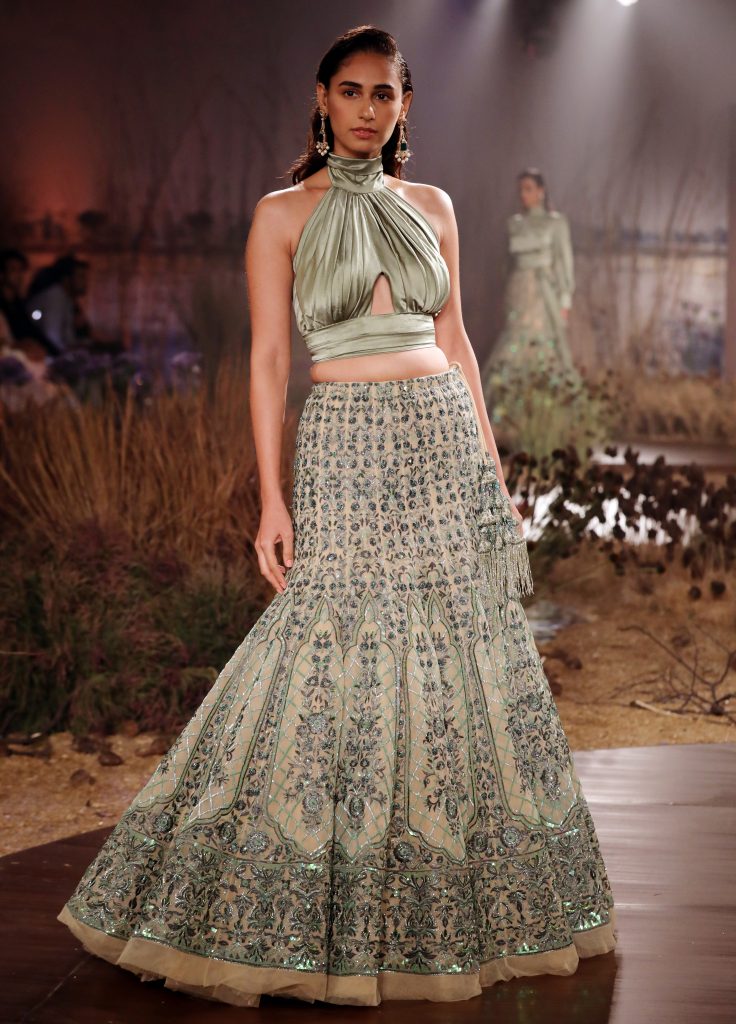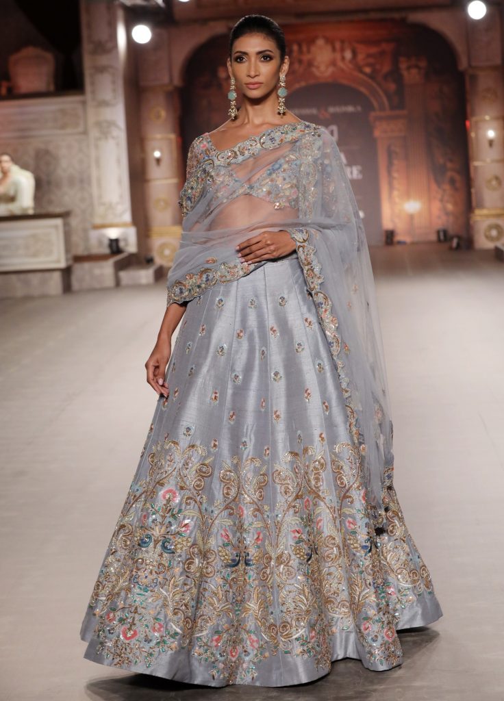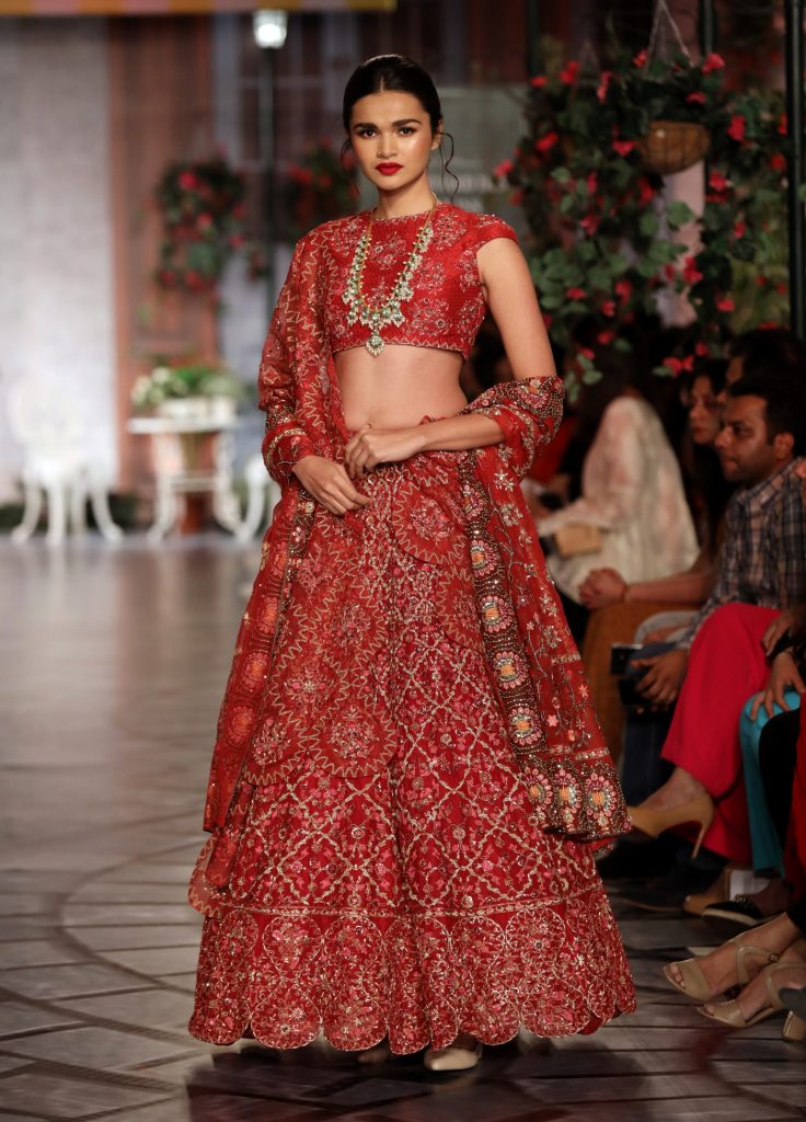 weddings and lehengas go hand in hand. lehengas are the first thing we think of when it comes to wedding season. this season also Lehengas have topped our list with elegant thread work red lehengas by Rahul Mishra, beautiful intricate graphic lehengas by Designer Sulakshna Monga, lavish dark greys and furs by Designer duo Falguni and Shane.